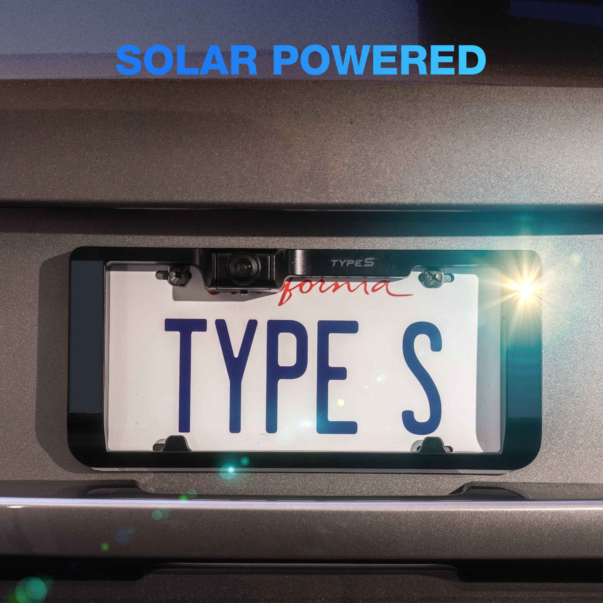 TYPE S Solar Powered Portable License Plate Frame Backup Camera with HD monitor built into rear-view mirror. Smart Wireless Button Control—